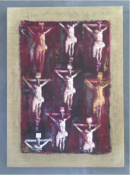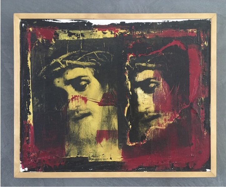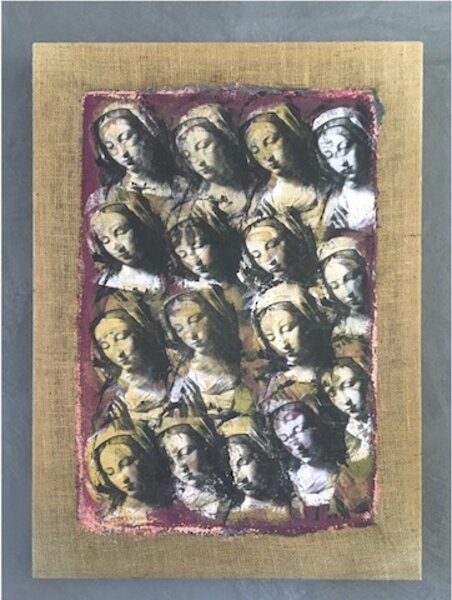 La sperimentazione di tecniche e di materiali diversi spinge Giovanni Massarin a sviluppare una ricerca personale, che vede il suo fondamento nella visione concettuale contemporanea legata al riciclo, al reimpiego e alla riproduzione. Riferimenti significativi all’arte informale si individuano nelle sue opere fin dagli inizi, soprattutto per l’impiego di pesanti impasti pittorici e per il recupero di materiali, come tele di juta o tavole di legno. Nella produzione recente, tale interesse si combina con una specifica ricerca sull’immagine e sulla sua riproduzione. In base alla lunga esperienza nella tecnica serigrafica maturata in ambito lavorativo, Giovanni Massarin indaga le possibilità artistiche e concettuali delle riproduzioni a stampa, con riferimenti anche alle sperimentazioni della Pop Art. Ad attirare la sua attenzione sono le immagini di opere del passato pubblicate su riviste e cataloghi. Volti di Cristo o della Vergine, Crocifissioni quattro-cinquecentesce si moltiplicano all’interno del campo visivo dell’opera. L’artista si sofferma sulla percezione dell’immagine sacra portavoce di un patrimonio storico-artistico diffuso, che fa parte dell’esperienza quotidiana. Giovanni Massarin propone una riflessione sul- le testimonianze artistiche in generale, sul loro degrado nel tempo e sulla loro alterazione nella memoria collettiva.