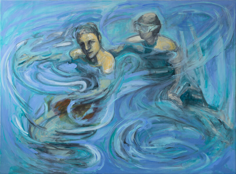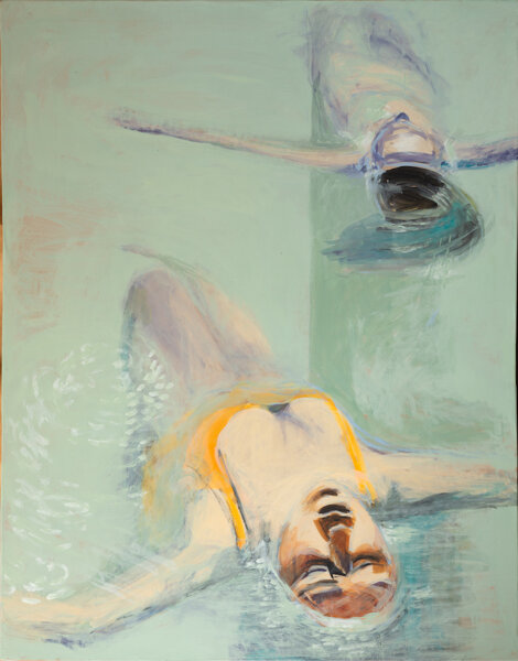 Questo ciclo di opere di grande formato “riporta a galla” nel 2024 i temi che le sono cari: corpi immersi nella privacy di una piscina, oppure nelle volute liquide di uno specchio di mare durante un bagno estivo. La sua notevole sensibilità per il colore le permette di creare atmosfere diverse. Trasparenze e corpi plasmati dall’acqua che li accoglie e li sostiene. È un riprendere le coordinate interiori, ritrovare riferimenti emotivi che diventano nuovi punti di ancoraggio visivo, “utili” per fare pittura.