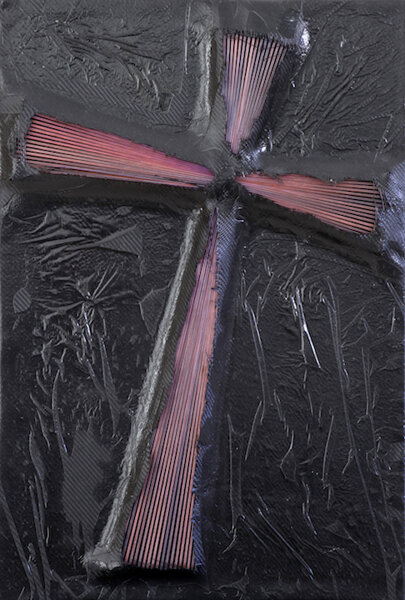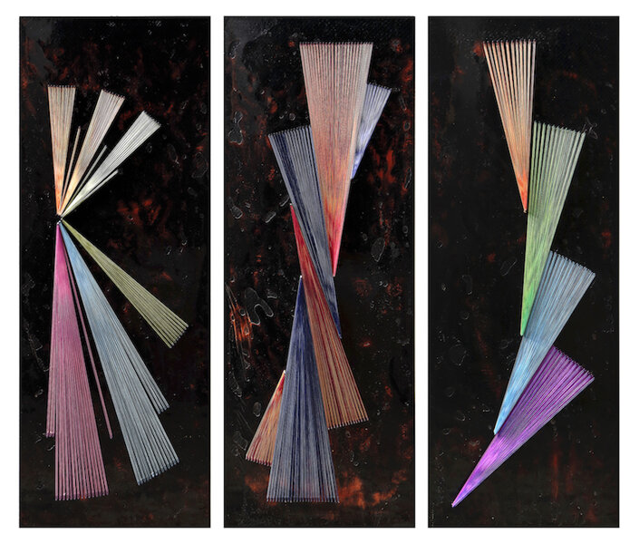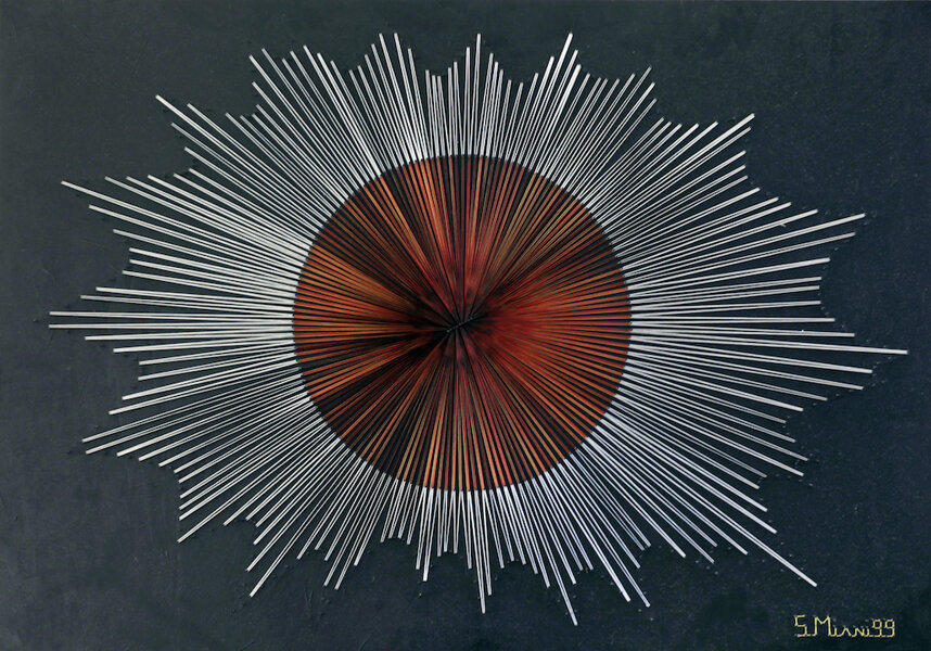 Nell’opera di Sandro Miani, il materiale contemporaneo Ih-tech della fibra di carbonio si combina con le antiche suggestioni cromatiche dei fili di seta, giungendo a esiti di forte dinamismo ottico-percettivo. Non è semplice definire il percorso di ricerca dell’artista che vede punti di contatto anche con aspetti della String e della Fiber Art. Ogni opera si sviluppa principalmente grazie a selezionate e innumerevoli stratificazioni di fili di seta capaci di determinare combinazioni sempre diverse. Il lavoro consiste nel tendere dei fili tra dei punti posti a una certa distanza allo scopo di far emergere delle figure di differente spessore o delle forme geometriche. I fili di seta riflettono la luce con maggiore intensità in relazione alle loro stratificazioni e inclinazioni, generando suggestioni ottiche sempre più raffinate e complesse. Nelle composizioni più articolate si giunge alla frammentazione geometrica e alla scomposizione cromatica dell’immagine. A volte lo sviluppo dei fasci luminosi crea movimenti aperti e spiraliformi, a volte invece le fibre si compattano in figure uniche e sfaccettate. Significative sono inoltre le opere in cui il supporto in legno viene rivestito di fibra di carbonio e la texture viene mossa, tagliata, sfibrata, in modo da divenire materia plastica in contrasto con le rigorose strutture dei fili di seta. Sempre diverse sono le suggestioni visive generate dalle contrapposizioni e dalle tensioni in cui l’accesa dinamica cinetica dei fasci luminosi taglia, si incunea fino a penetrare e a lacerare le maglie del carbonio.