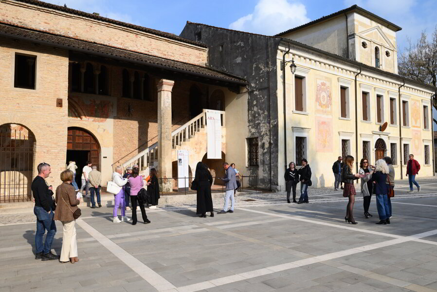 Al complesso abbaziale si accede attraverso il torrione “Grimani” che apre una panoramica deliziosa sulla corte, circondata dagli edifici principali del monastero: campanile, cancelleria, residenza abbaziale, arco rinascimentale, loggetta e portico d’ingresso alla basilica triabsidata.