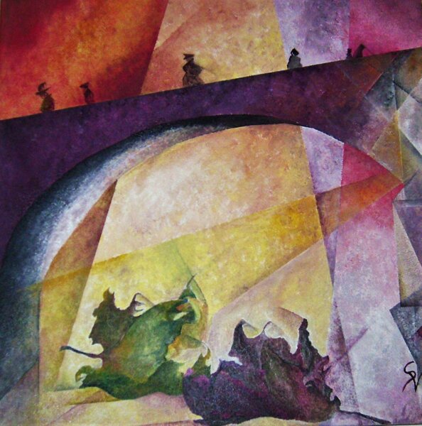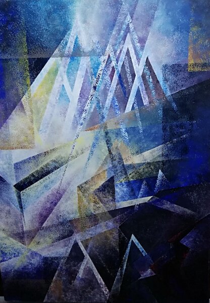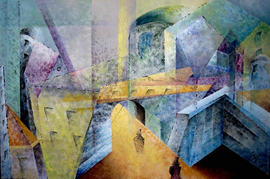 Nelle opere di Susanna De Vito, incrociamo le geometrie pulite e ben armonizzate di chiara luce cubista, rivisitate da una spontaneità creatrice, che fa emergere volontà d’infinto. Questo tipo di pittura, ci impone una riflessione sullo spazio, quella che dà all’artista la possibilità di creare un’altrove, un’ infinito entro i bordi finiti della tela. In questo l’uso di tonalità più o meno intense, lo sfumato alternato ai colori forti e pesanti, ci viene in aiuto, facendoci percepire i paesaggi, borghi, palazzi come infiniti. Sono proprio le geometrie ben studiate, le forme costruite scrupolosamente, le linee essenziali che vanno a determinare l’impianto prospettico dandoci la sensazione d’infinito e di aperto. Va anche detto che le delicate trasparenze azzurre che via via dischiudono i blu più intensi, come in un crescendo armonico, vanno a dilatare gli spazi.